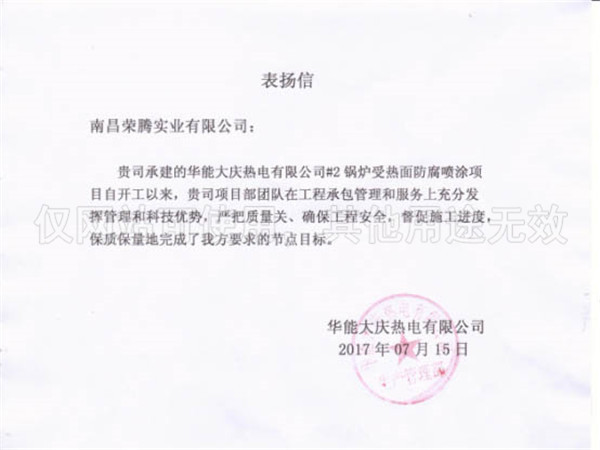 華能大慶熱電有限公司表揚(yáng)信